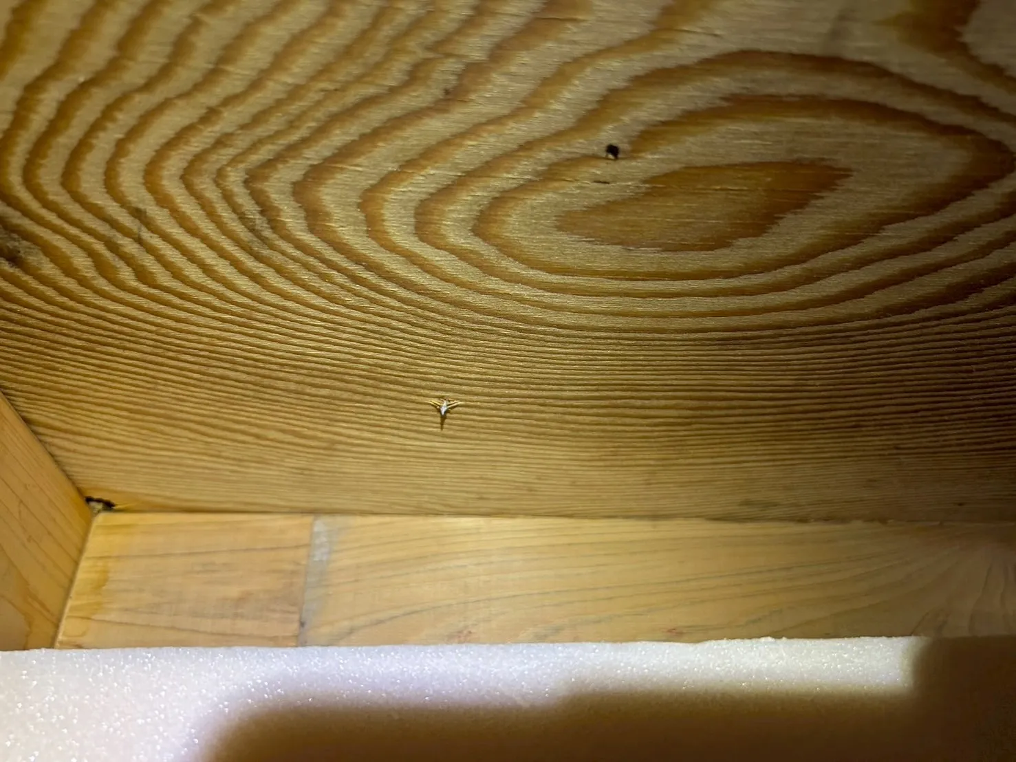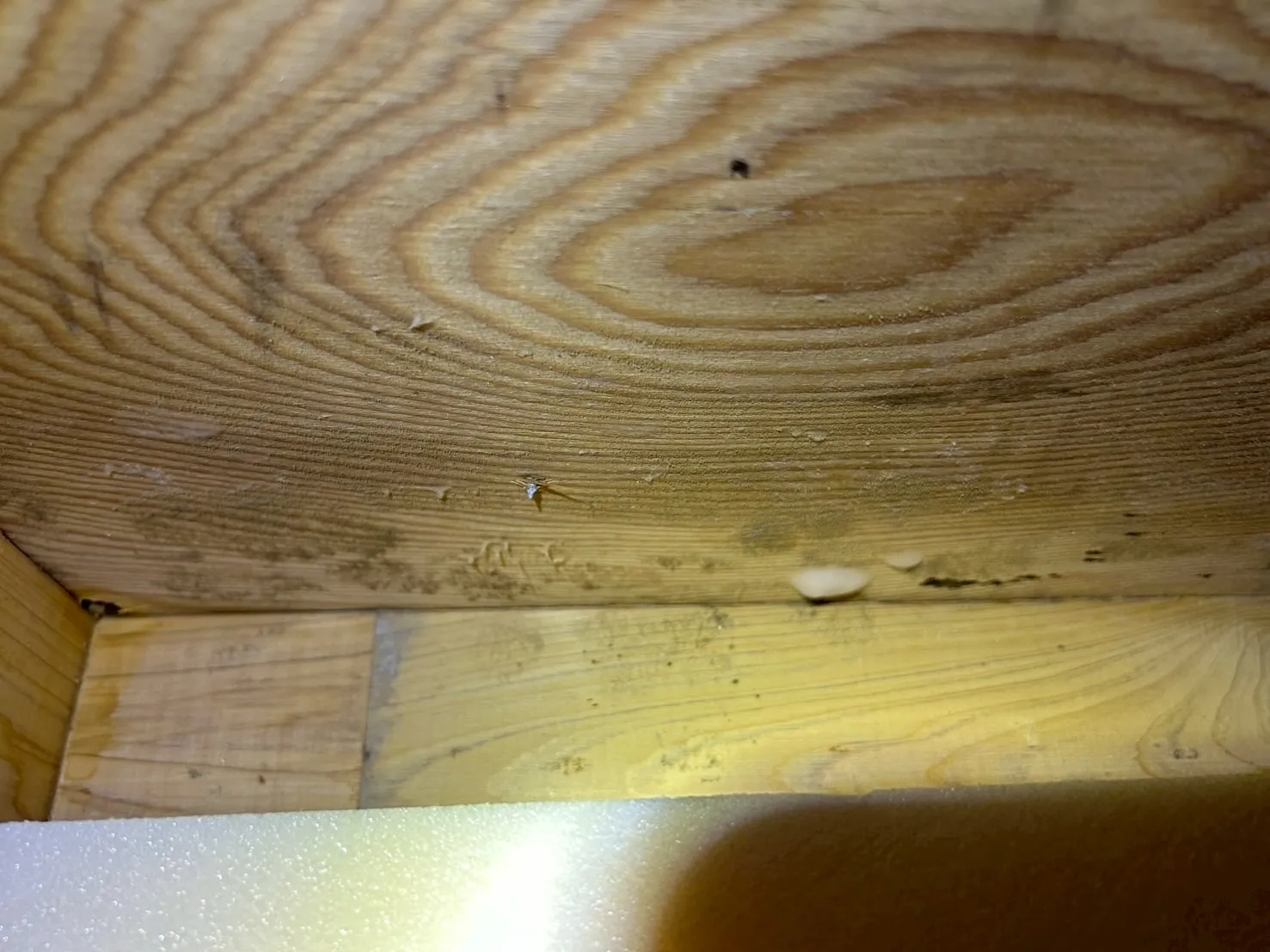漏水が原因で発生したカビは、配管周辺だけでなく、湿気が広がった範囲すべてに繁殖していました。特に木材部分は、黒カビが点在し、見た目にも明らかでした。