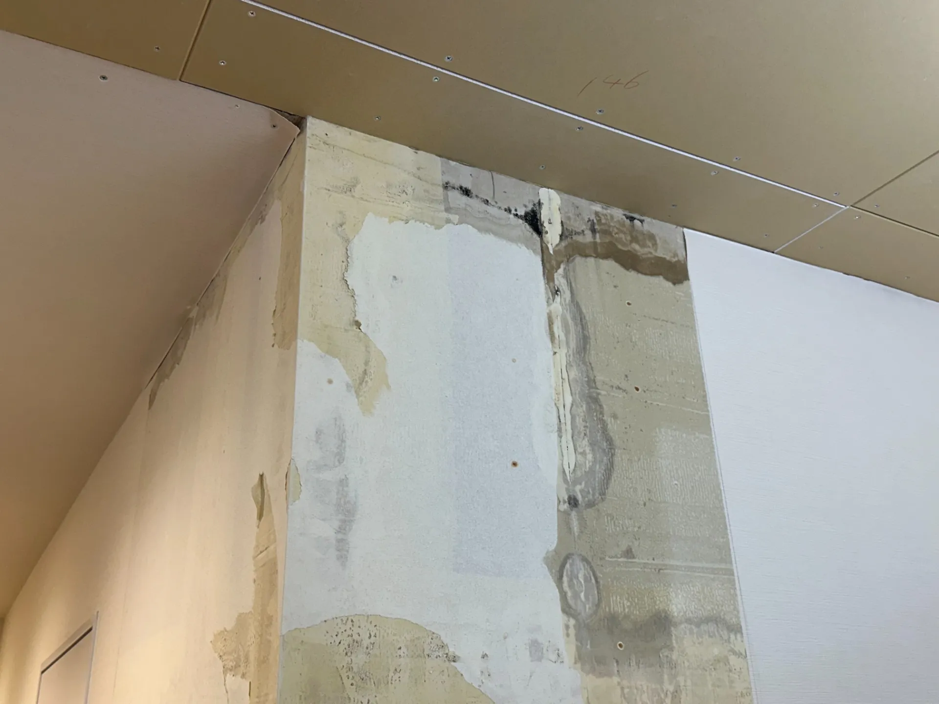 壁紙の裏側でカビが進行し、石膏ボードがじわじわ侵食されてから、ようやく表面に点やシミが現れます。