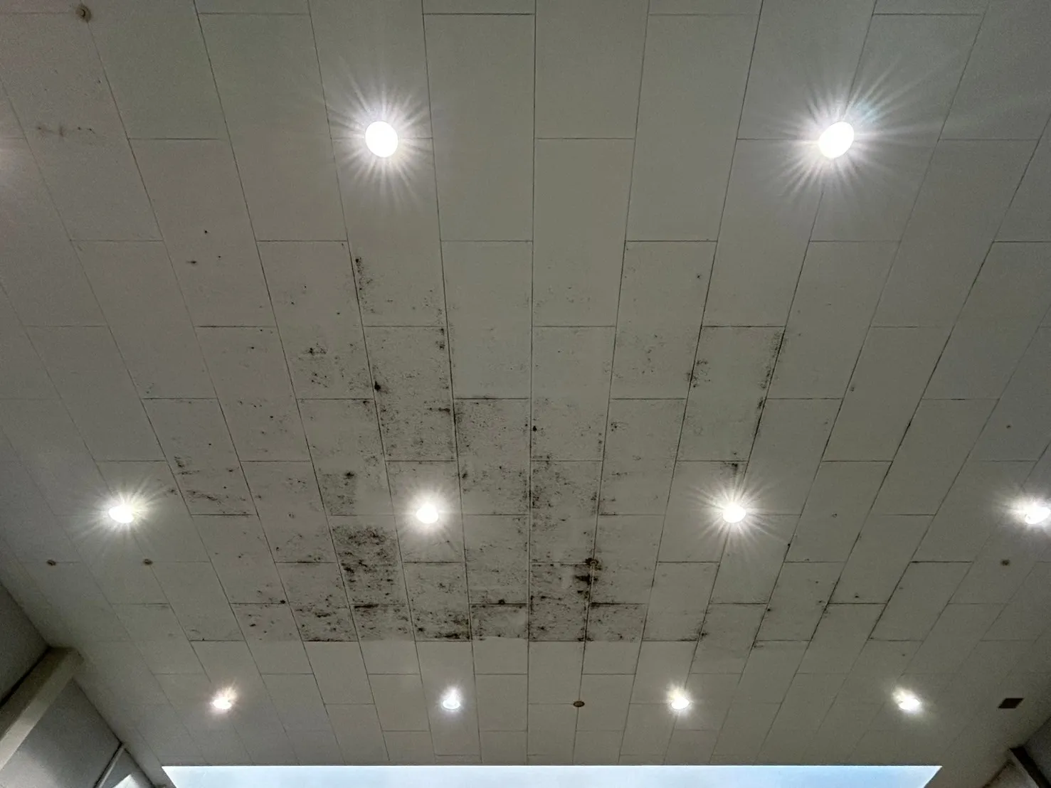 もっともご相談が多いのが、天井や壁に発生する黒カビです。特に空調の影響や温度差による結露が原因となり、水分がたまりやすい場所に発生します。最初は小さな点のように見えますが、放置するとどんどん広がり、最終的には天井一面に広がることもあります。